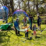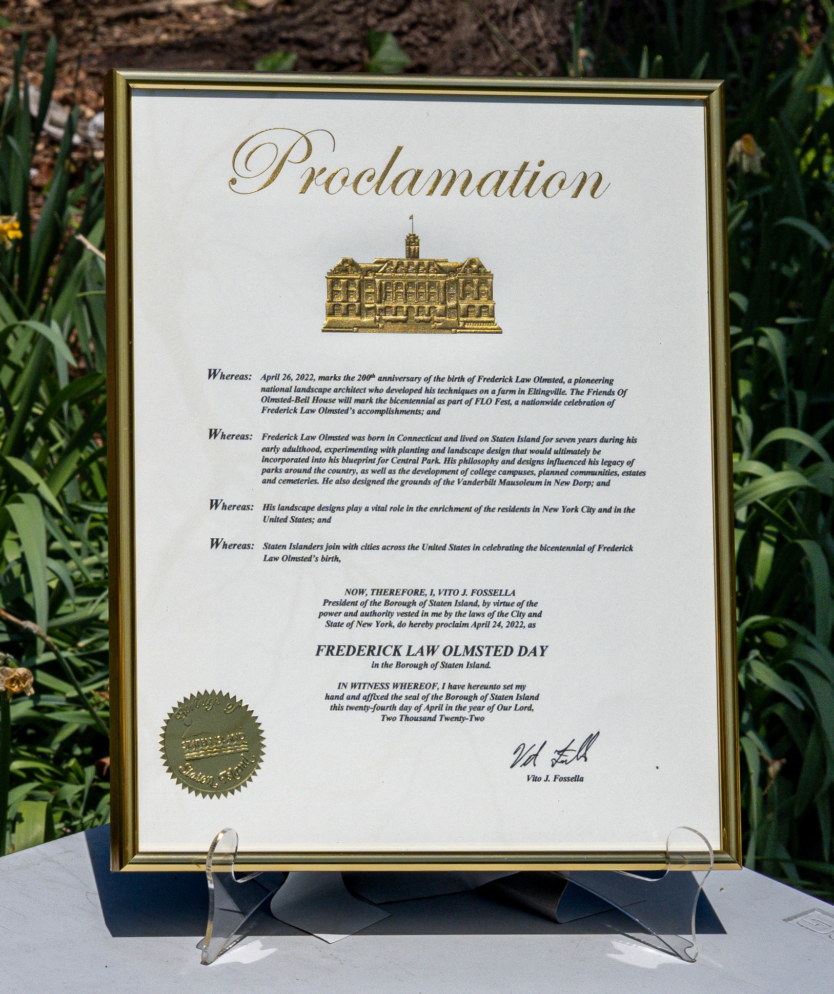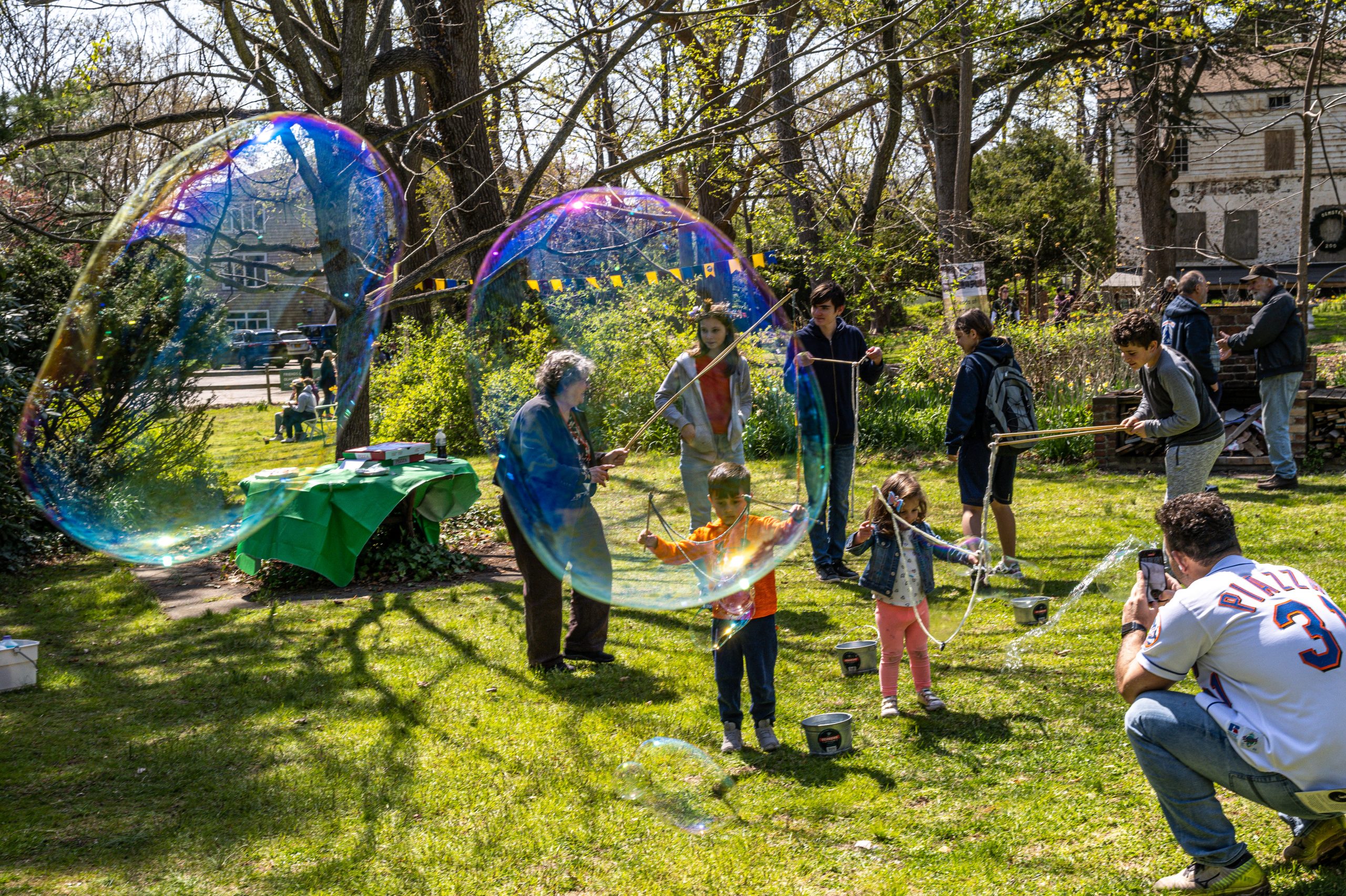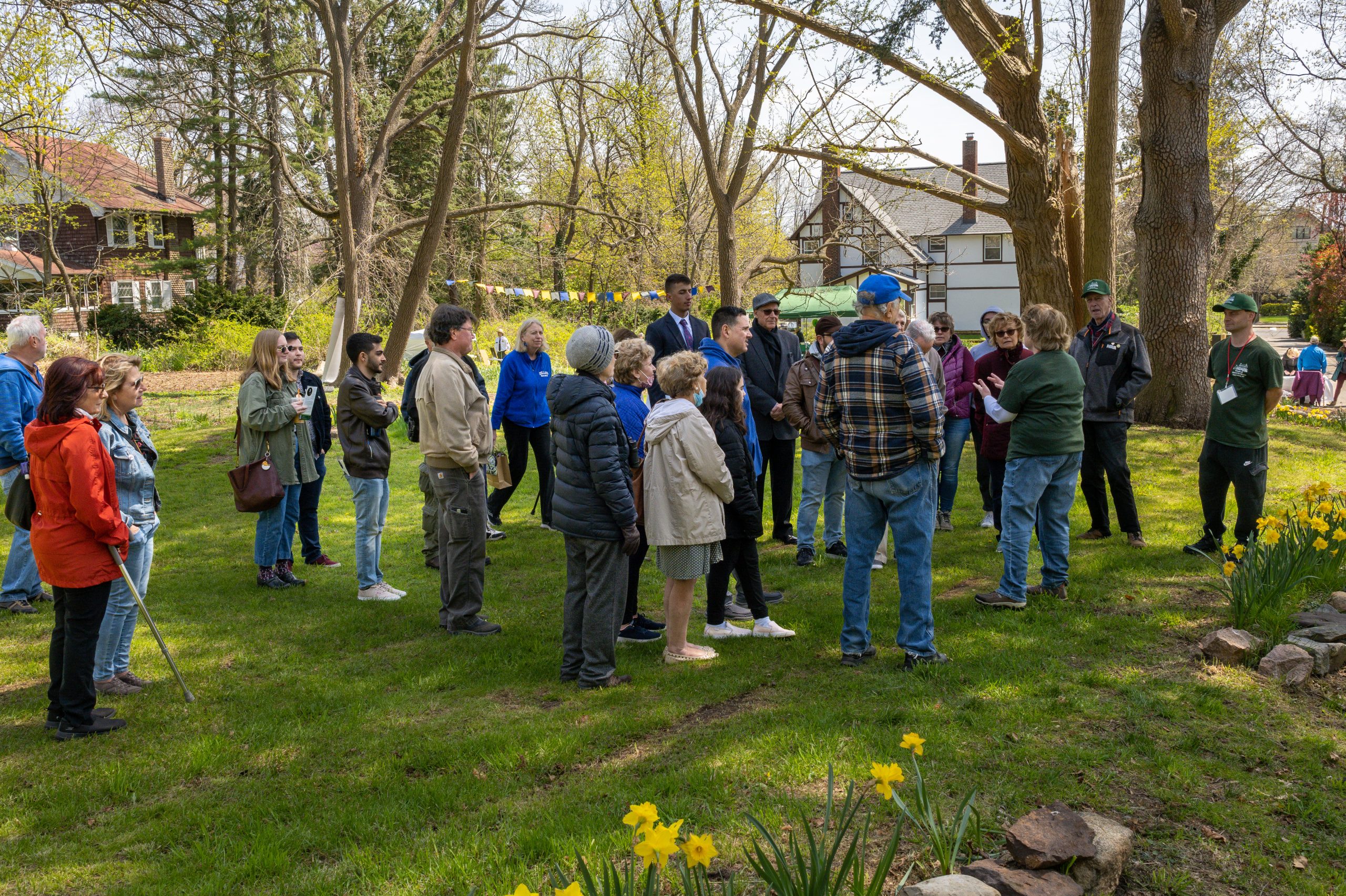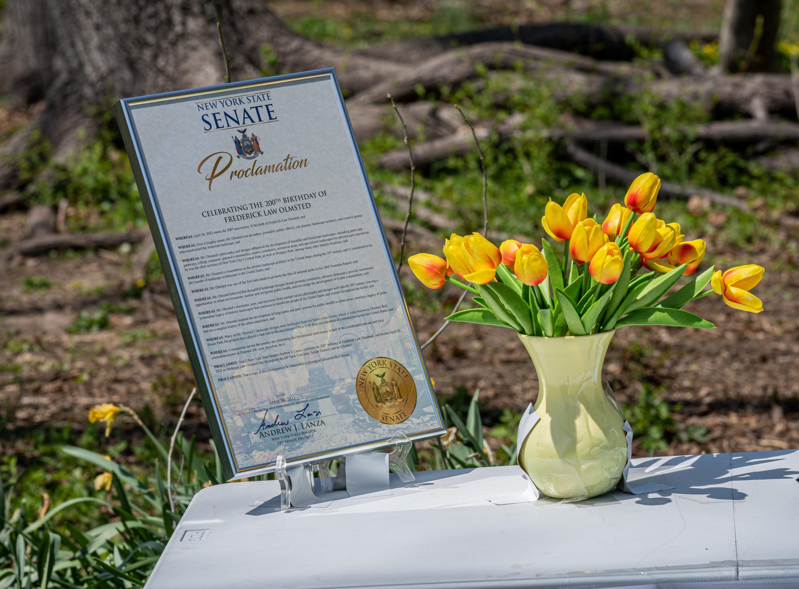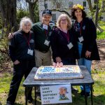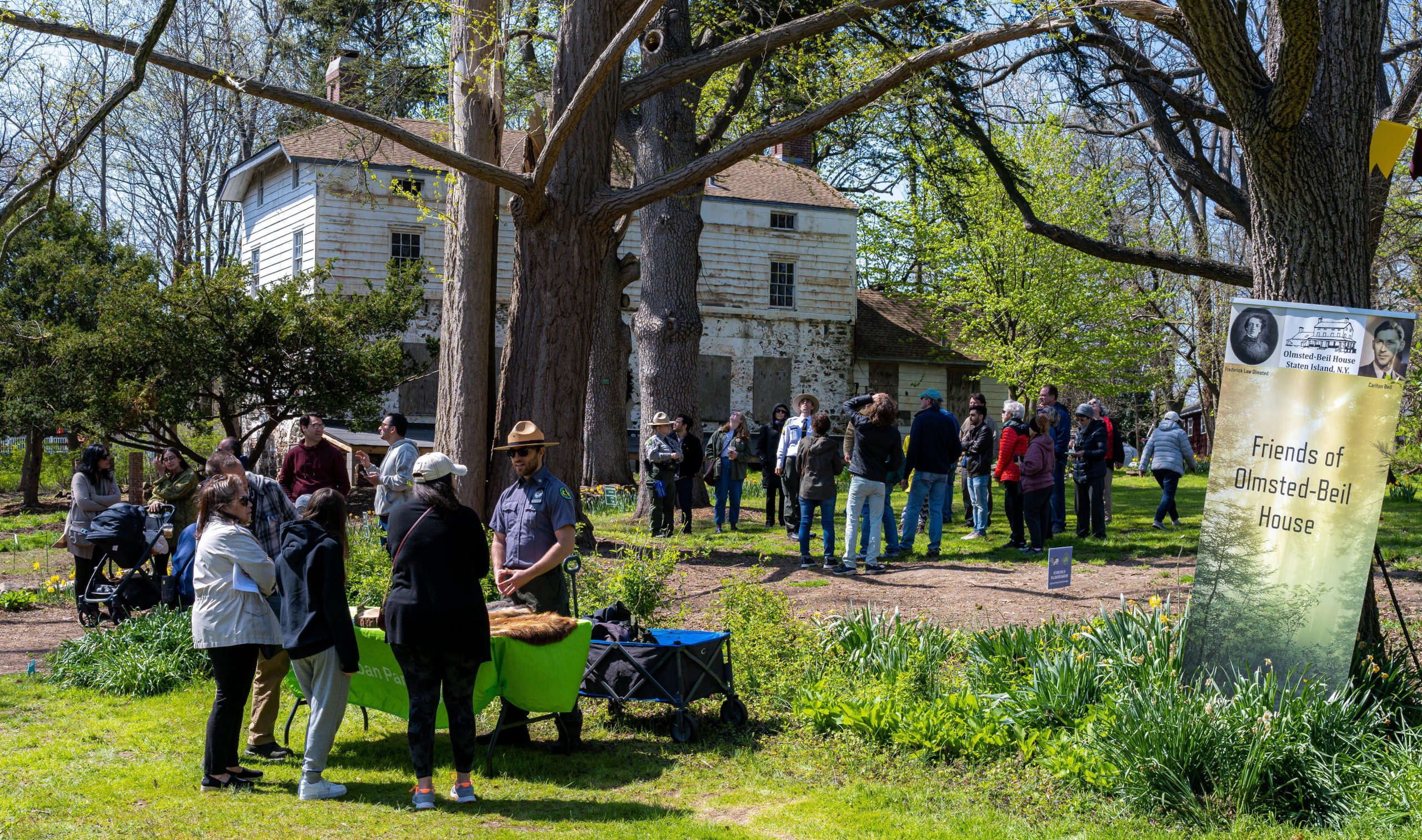 April 24, 2022 – FLO Fest, a celebration of the 200th anniversary of Frederick Law Olmsted’s birth, was the first public event ever to be held at Olmsted-Beil House Park. The event featured crafts, games, storytelling, site tours by FOBH historian Patricia Salmon and tours of the Great Trees by the NYC Urban Park Rangers, and refreshments, including birthday cake. Commemorative proclamations from NYS Senator Andrew Lanza and Staten Island Borough President Vito Fossella were read aloud. (Photos: Lance Reha)
